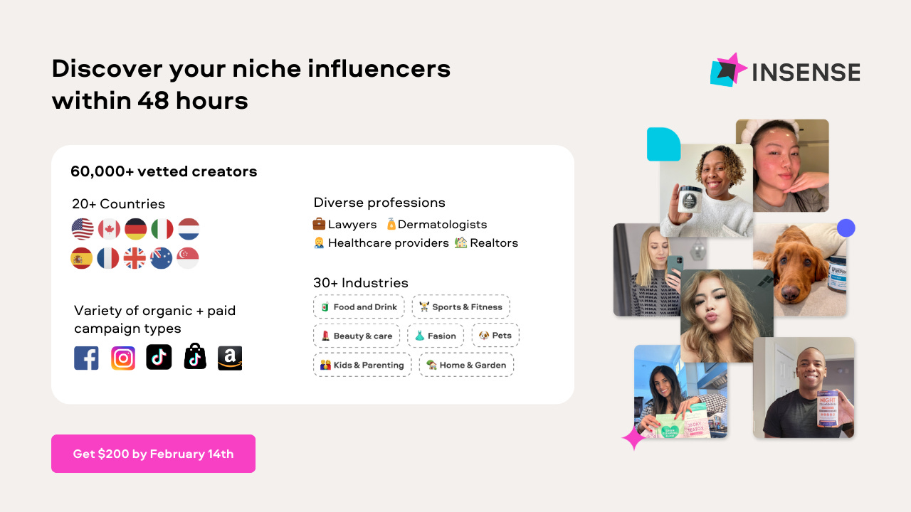 2,000+ e-com, DTC, and Amazon brands are using Insense to find their perfect niche creators and run diverse collaborations from product seeding and gifting to TikTok Shop and affiliate campaigns, and whitelisted ads.