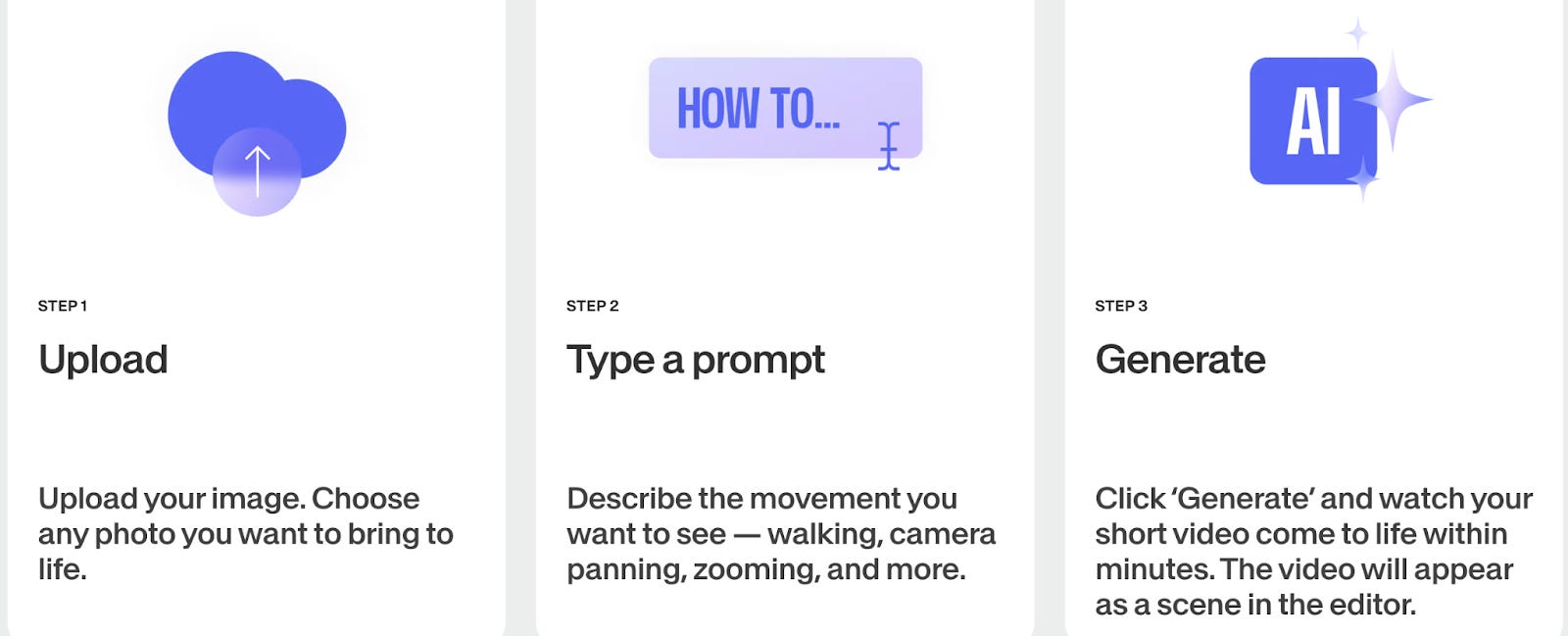 With VEEDās Image-to-Video AI, you can turn a still image into a dynamic video in just 3 steps: